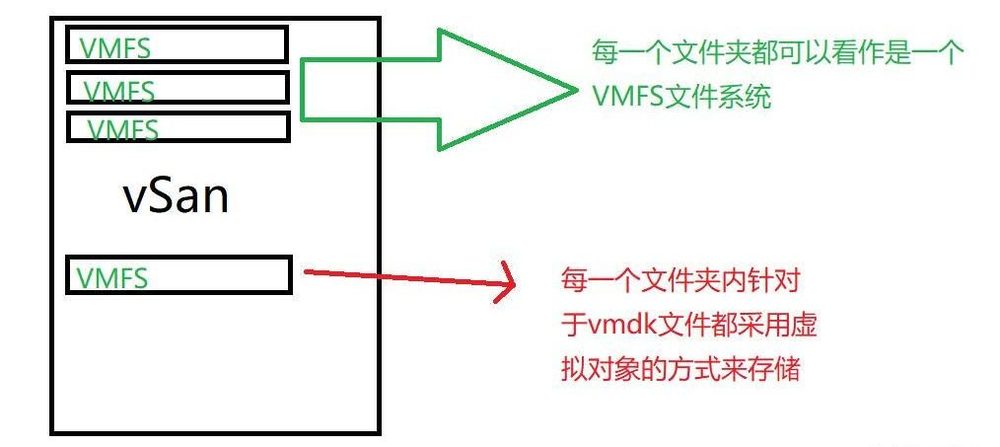 通过我司技术工程师现场分析梳理,发现出现问题的虚拟机存储策略与其他正常虚拟机策略不一致,该虚拟机采用的是RAID0结构的策略,并且未使用置备,其他虚拟机均采用RAID1策略,使用100%置备。重建该磁盘组的时候,其实涉及存储在该磁盘组的虚拟机已经全部出现故障,但是由于使用100%置备策略的原因,已经自动降级,然后自动恢复并且又继续使用100%置备策略,故这些虚拟机都能够自动恢复成正常的状态,但没有使用该策略的虚拟机则不能自动恢复,出现数据丢失。vSAN与VMware传统的VMFS文件系统存在一定的相似性,可以理解为vSAN是一个大的分区,这个分区内每一个文件夹都是VMFS相似的结构。首先访问vSAN,才能访问下一层级的VMFS文件系统,只不过在vSAN下面的VMFS文件系统内,对虚拟磁盘VMDK文件的存储有特殊的定义。