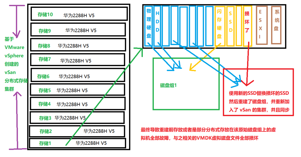 整个VMware vSphere共控制多个集群,其中出现故障的集群使用的vSAN分布式结构存储,该vSAN由10台华为2288H V5 存储构成,每一台存储由2块HDD(物理盘)和一块SSD(闪存盘)构成1个磁盘组,每台存储都有4个磁盘组。